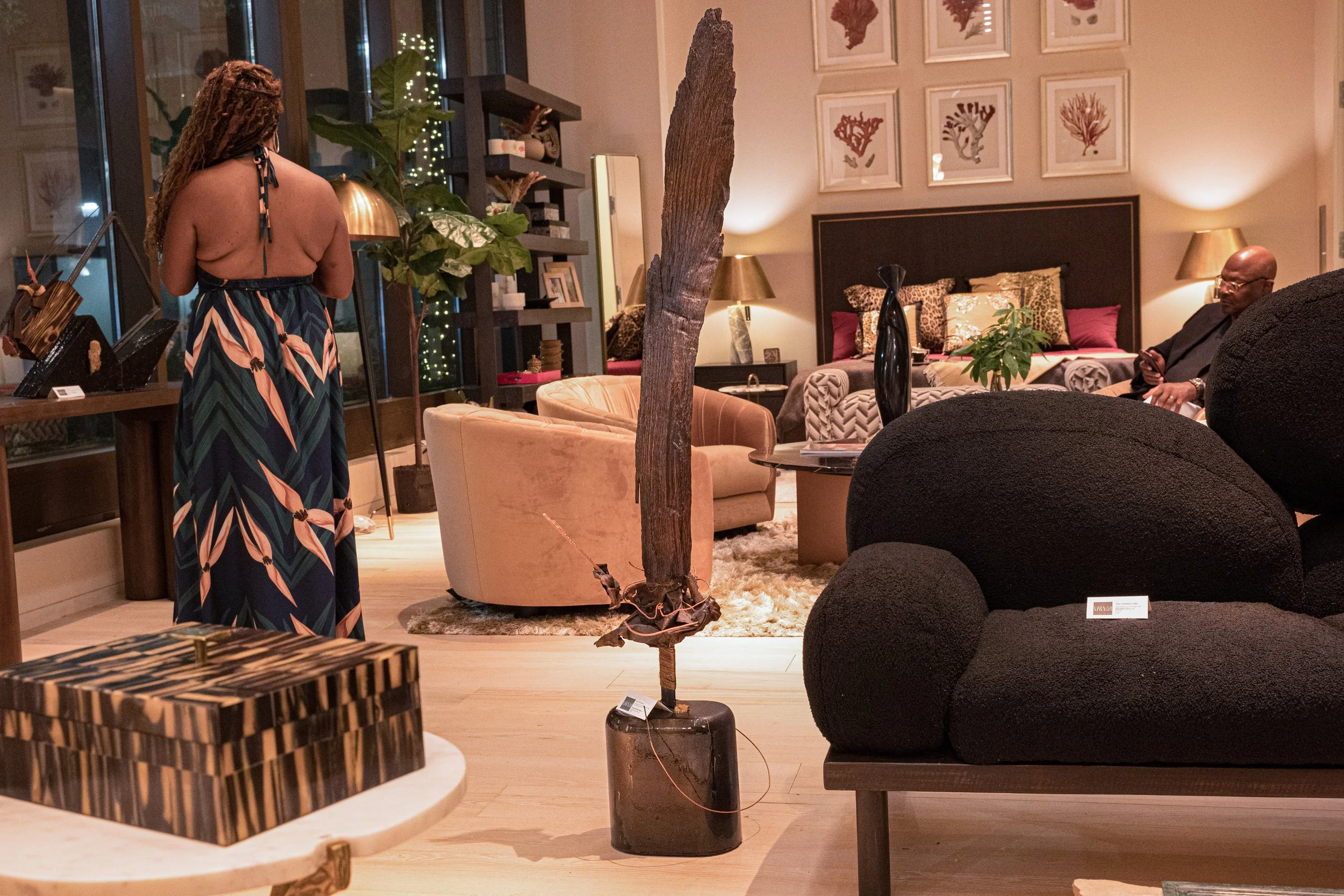 For its debut at Casa Ya Mwezi 2025, Palm Print was paired with the Limba loveseat by Kieta Rose, Queen’s Flame by Hopeton St. Claire Hibbert and a selection of African antiques from Twin Brothers Gallery.