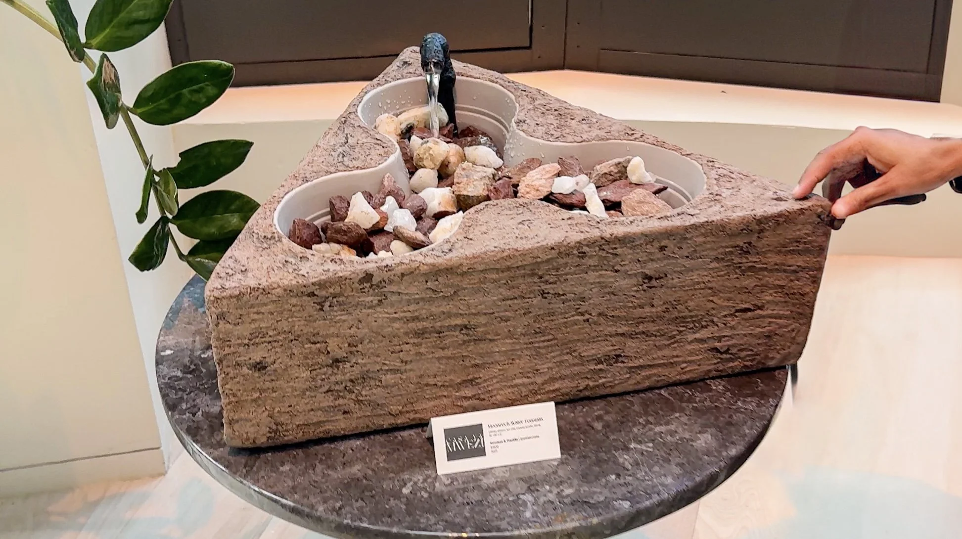 Moonrock was situated at the entrance of the exhibition. A fluid but grounding energy greeted the guests, activating their senses through soft water rippling. This water feature is composed of plaster of paris, stucco, Georgia red clay, acrylic, copper and stone.