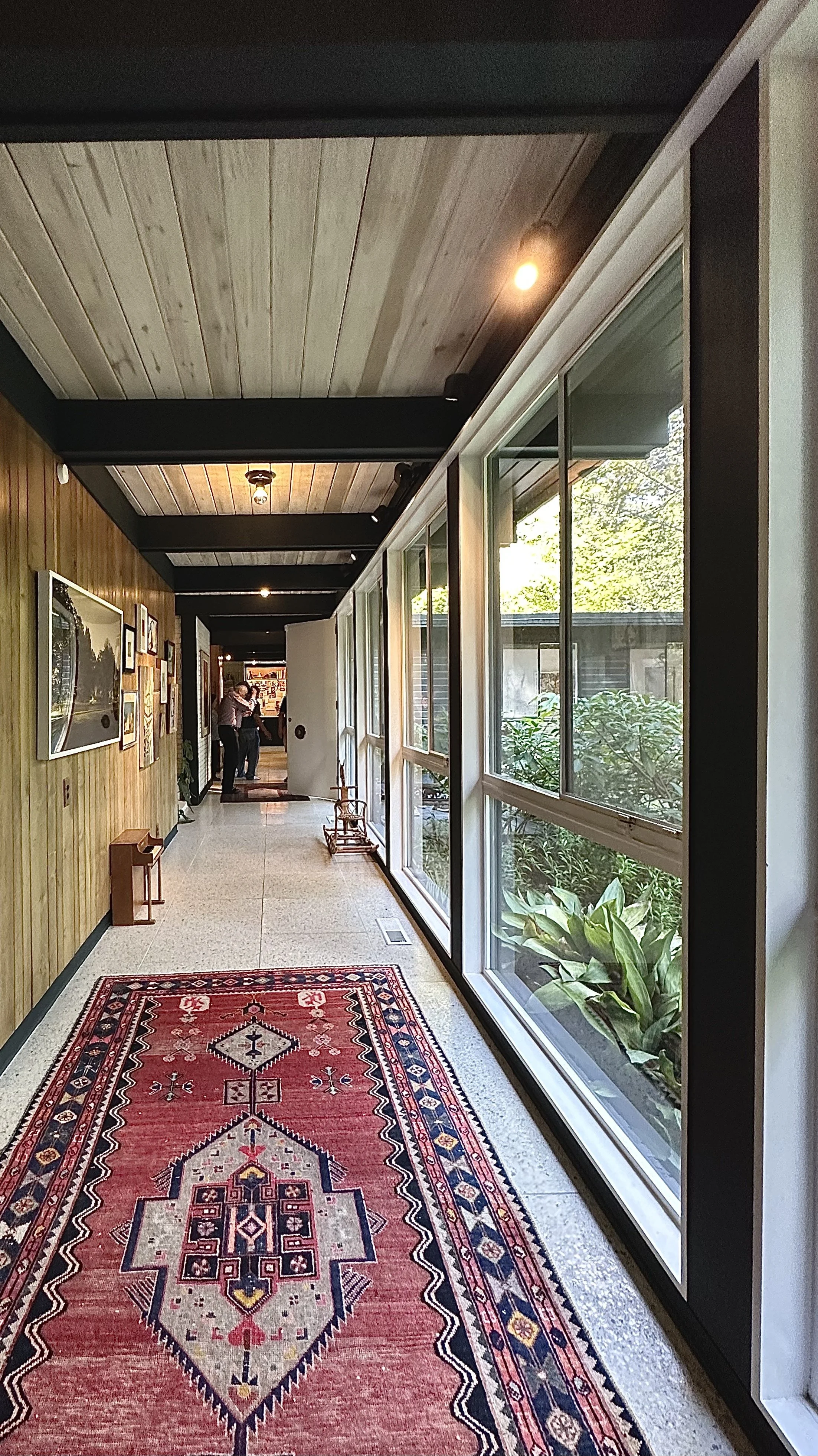 A dark wood-paneled wall lines the hallway that connects the kitchen at the front of the house to the den, bar and guest room at the back of the house. About 12-feet high, this statement hall is something you might see in a hotel lounge or luxury retail shop. Installing a wall like this in a residential space says “Our home life is exciting enough to warrant such a statement.”