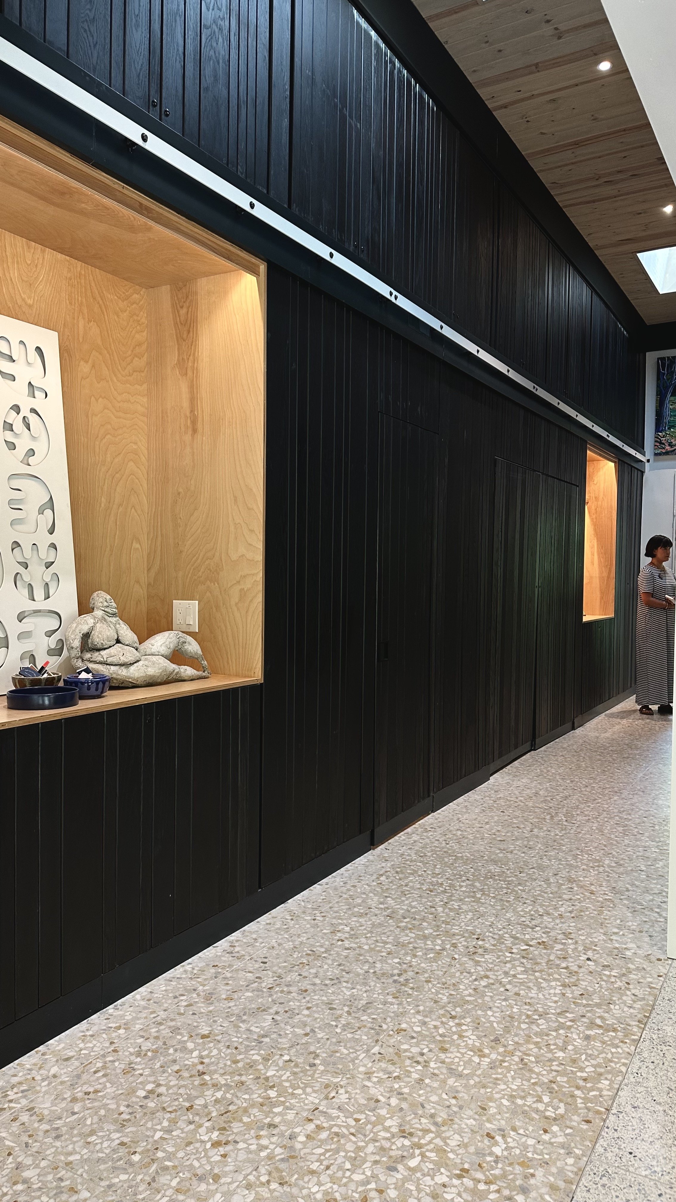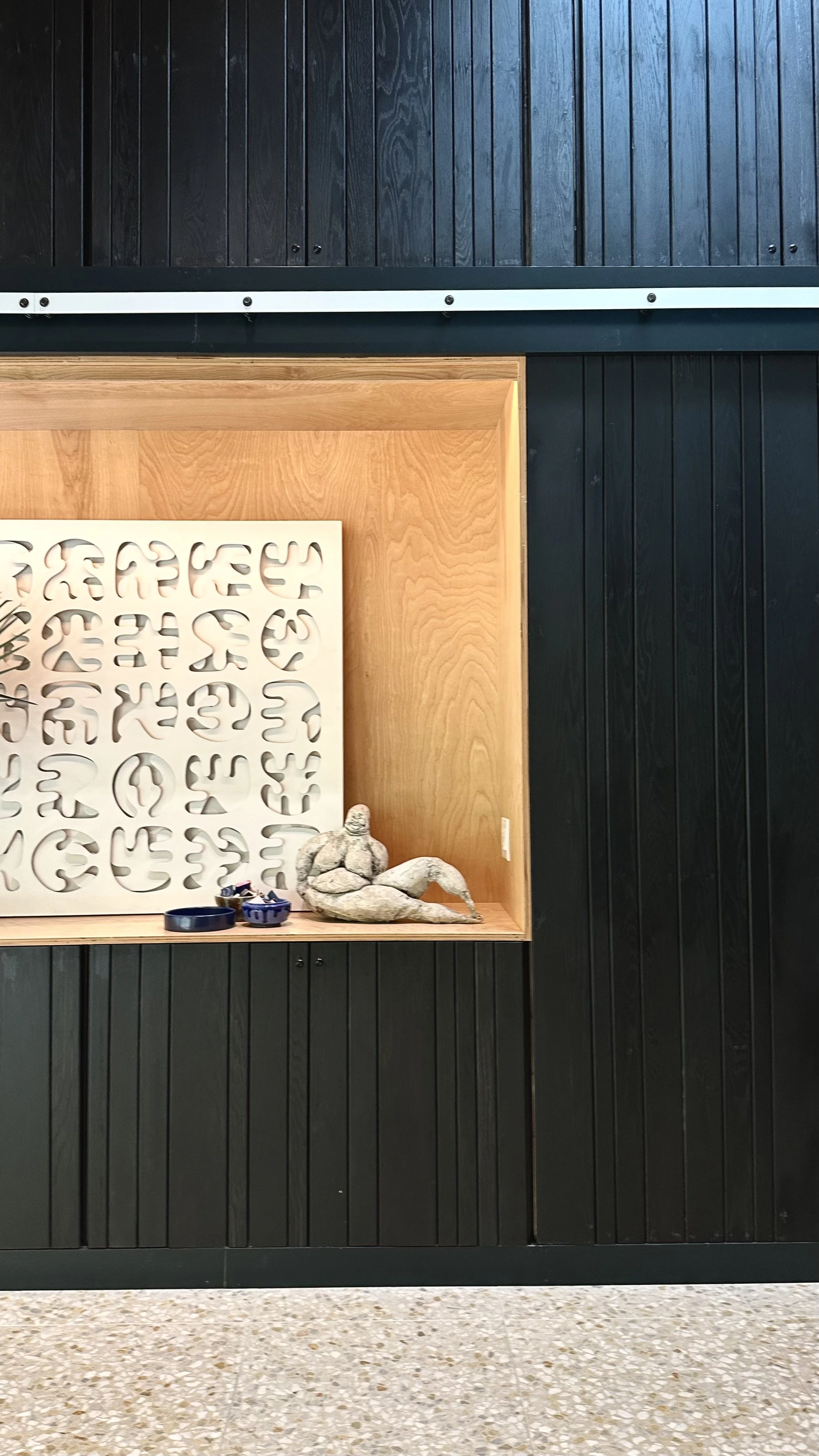 The dark color is broken up by light wash, warm-lit recesses in the wall. I’m calling them art boxes. One features a stone figure sculpture, a matchbook collection and wood artwork by Esteban Patino, an Atlanta-based artist. The other has bookshelf and something like a bulletin board displaying childrens’ artwork, family photos and save the dates.