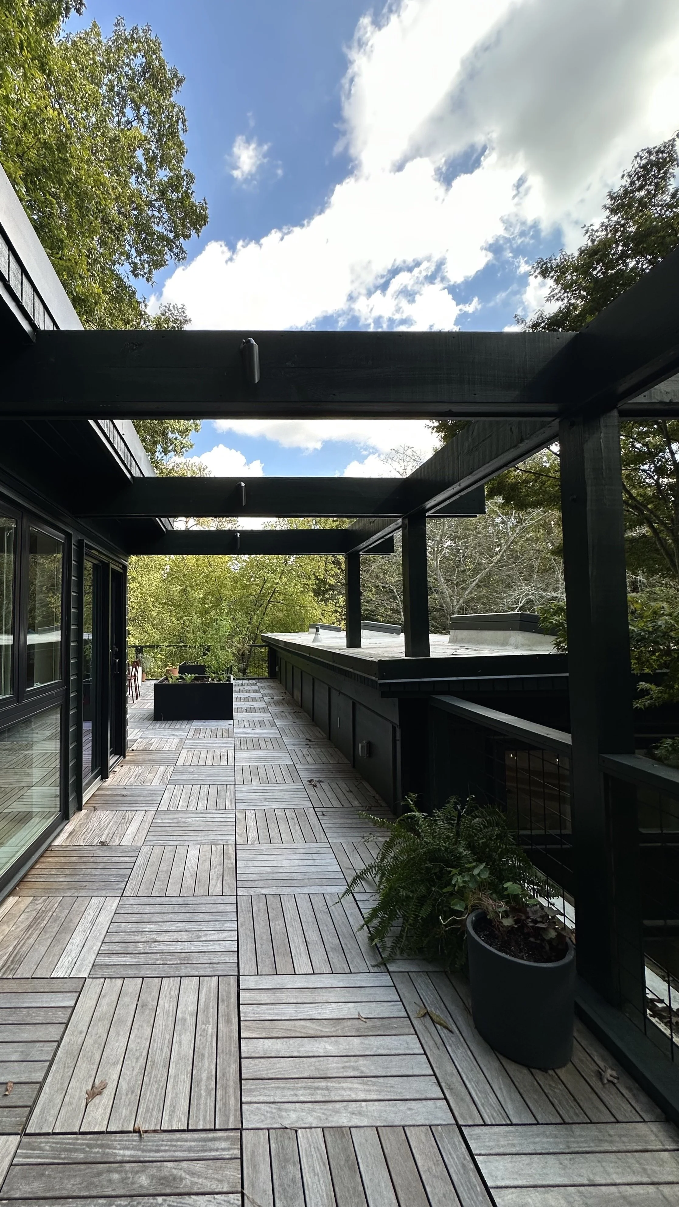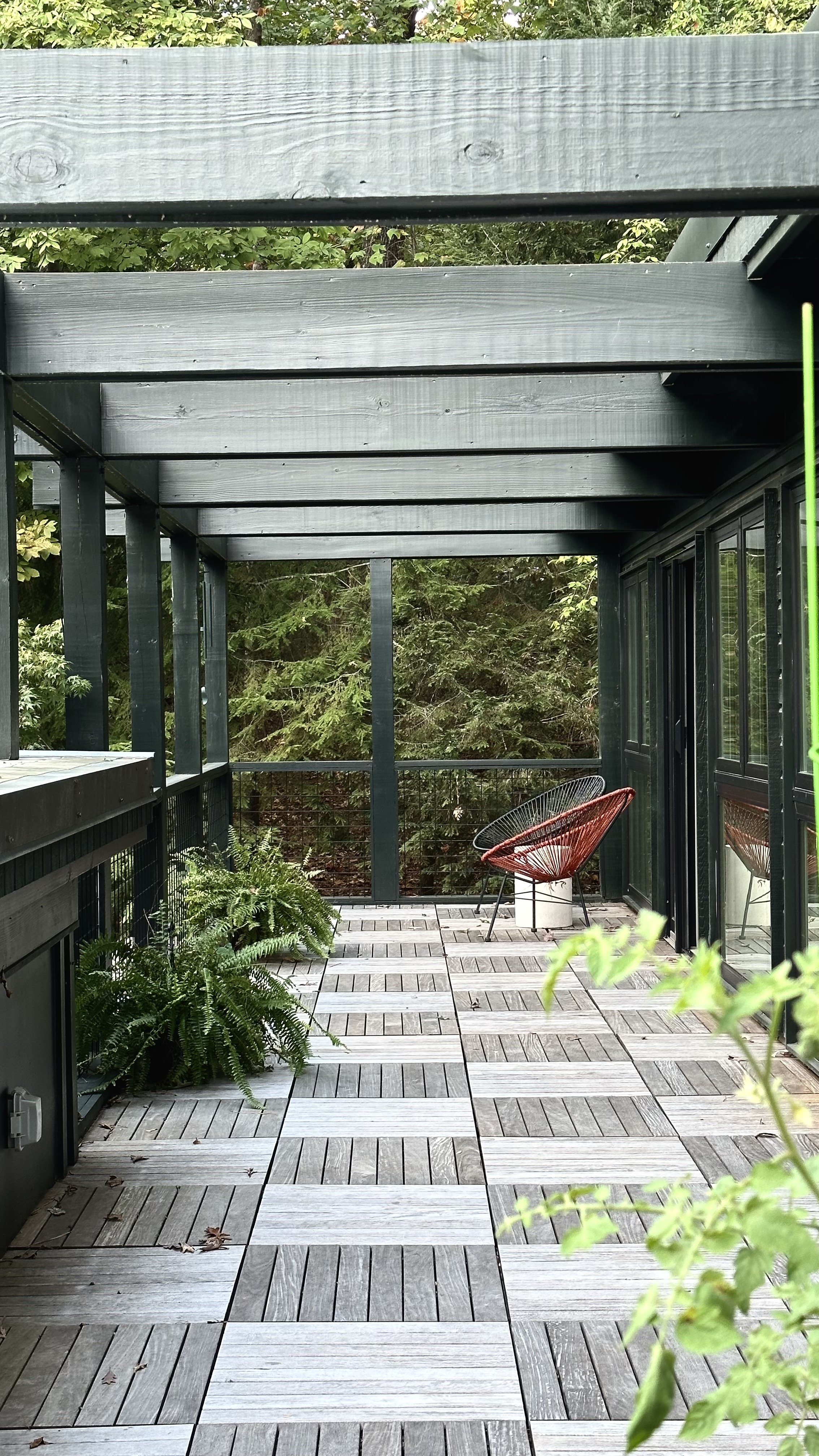 The exterior paint of Cloudhouse is where midnight blue and forest green meet. Exposed wood beams throughout the home interior are stained that color, creating a seamless conversation that flows between outside and inside.