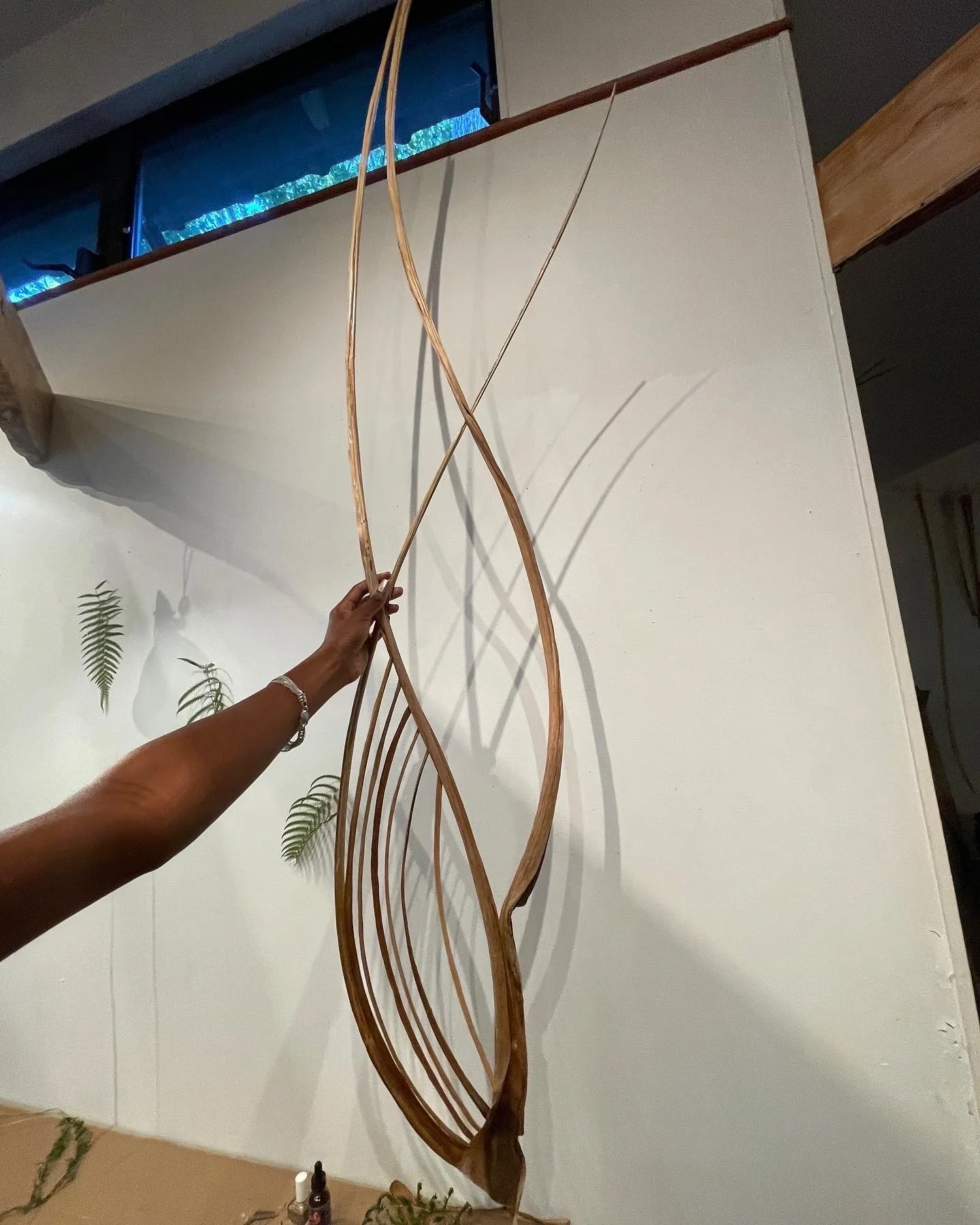 A featured piece in the Mother Musa collection, Today I Met the Mothers is a standing sculpture composed of hand-harvested banana fiber. Banana leaves were stripped to their midribs before being shaved, attached and hardened with various fiber stiffeners. Lines are held together with tension and industrial adhesive. The undulating silhouette, featuring three angular windows enclosed by a single antennae at the highest point of the sculpture, was arranged intuitively with guidance from the spirit of the banana plant.